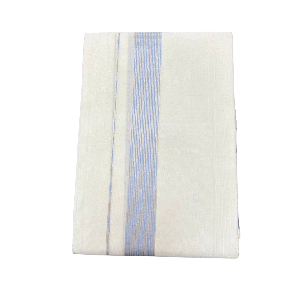 “Ramsons Premium Handloom Cotton Double Dhoti RMHD38 with Blue and Silver Kara, crafted from pure cotton for weddings, rituals, and cultural wear.”