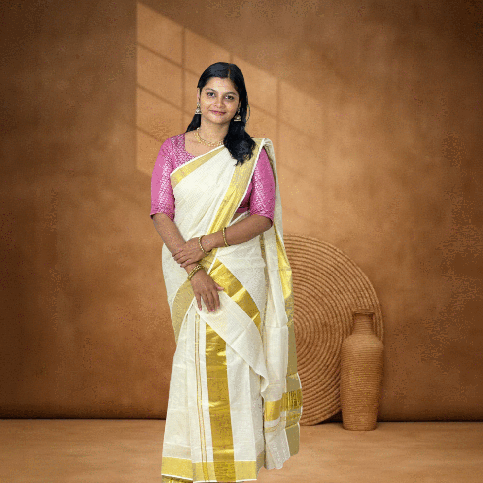 Ramsons Golden Check Design Single Set Mundu – RM119 is a classic Kerala traditional wear featuring elegant golden checked detailing on a soft, comfortable cotton fabric. Perfect for daily use, temple wear, and cultural occasions.