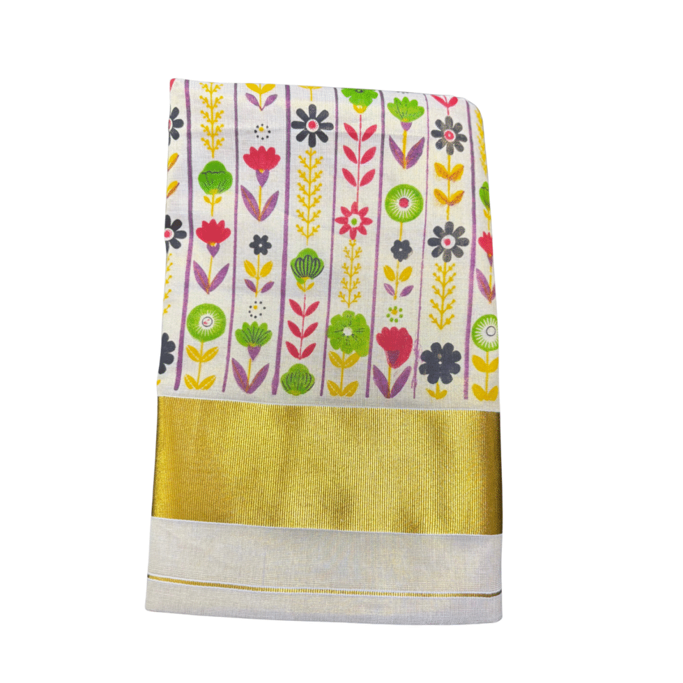 Experience timeless elegance with the Ramsons Floral Print Tissue Set Saree – RM4388, crafted to celebrate Kerala’s classic set saree tradition with a modern floral touch. Made from high-quality tissue fabric, the saree offers a gentle sheen and a smooth, comfortable drape suitable for any festive or traditional occasion.